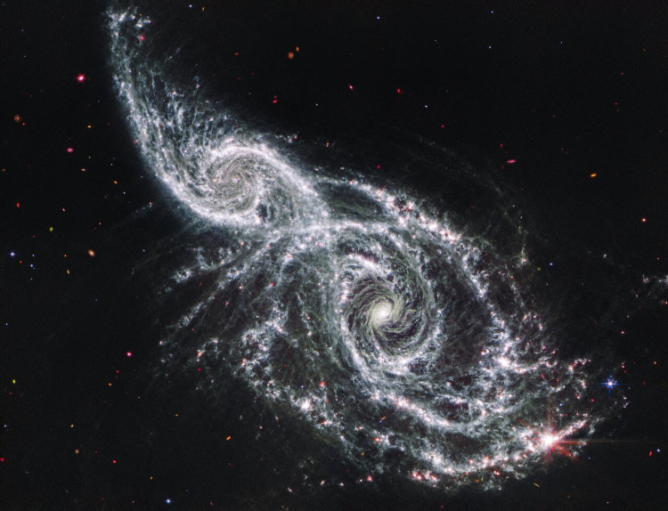 Adeta donmuş bakışlarla iki büyük ışıltılı 'göz'ün, uzayın uçsuz bucaksız mesafelerine baktığını gösteren bu fotoğraf, IC 2163 ve NGC 2207 galaksilerinin James Webb Uzay Teleskobu'nca çekilen orta kızılötesi ışınları ile elde edildi.