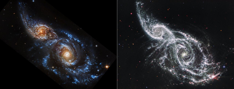 Birbirine teğet iki sarmal gökada olan IC 2163 ve NGC 2207'ün iki ayrı görüntüsü. Soldaki fotoğraf NASA ve ESA'nın sahibi olduğu Hubble Uzay Teleskobu'nun ultraviyole ve görünür ışık gözlemi sağdaki fotoğraf ise NASA, ESA ve CSA'nın sahibi olduğu James Webb Uzay Teleskobu'nun orta kızılötesi ışık gözlemi ile elde edlmiş.