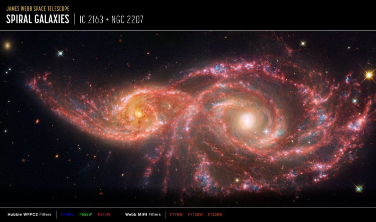 Bu görüntü, Hubble ve James Webb uzay teleskopları tarafından çekilen IC 2163 ve NGC 2207 galaksilerinin görüntüsüdür. Hubble'ın verileri Geniş Alan Gezegen Kamerası 2'den (WFPC2) alınmıştır. Webb'in verileri ise Orta Kızılötesi Enstrümanından (MIRI) alınmıştır.