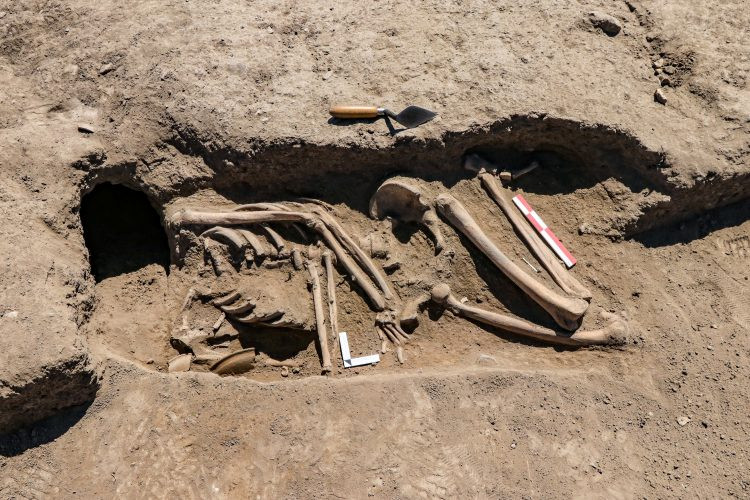 Kafatası olmayan hoker durumundaki iskelet (bacakları karına doğru çekik, bir yana yatırılmış) kazı ekibindeki bilim insanları tarafından incelemeye alındı.