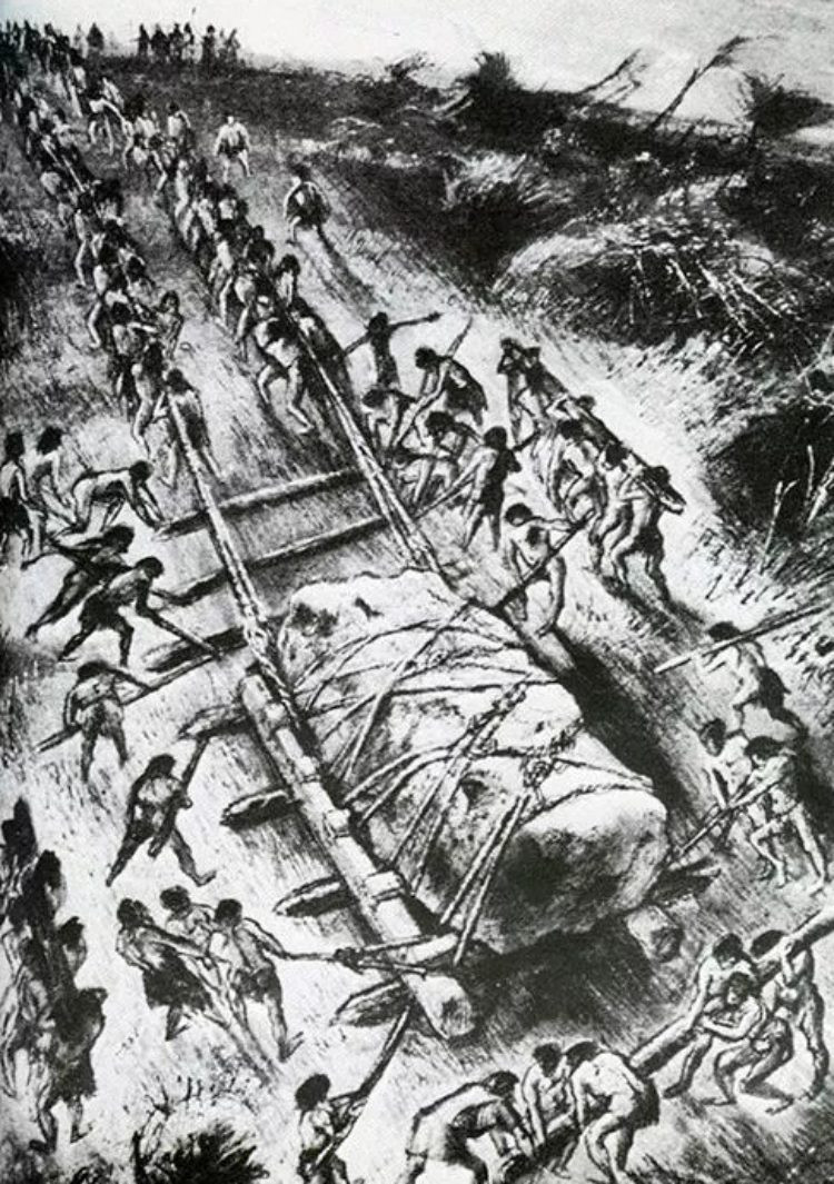 2 ton ağırlığa sahip taşlar, bir kızağa yerleştirerek, kütüklerin üzerinden kaydırılmış olabilir