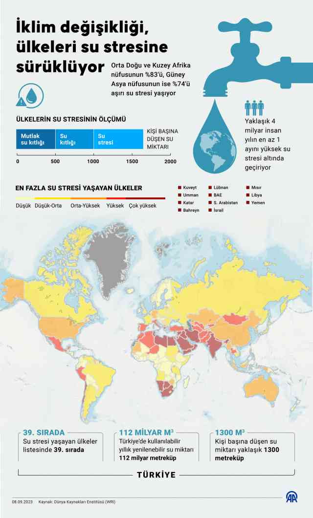 Toplam 164 ülkenin verilerinden yola çıkılarak hazırlanan; su stresi yaşayan ülkeler listesinin ilk sırasında Kuveyt bulunuyor. Bu ülkeyi Güney Kıbrıs Rum Yönetimi, Umman, Katar, Bahreyn, Lübnan, Birleşik Arap Emirlikleri (BAE), Suudi Arabistan, İsrail ve Mısır takip ediyor. Türkiye ise listede 39. sırada bulunuyor.