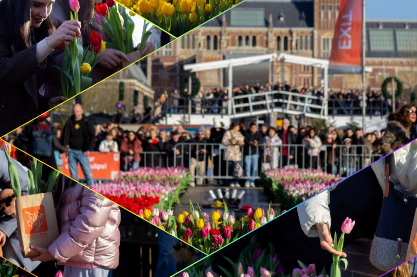Hollanda Lale Günü'nde, 10 lale seçme hakkında sahip oldukları için ellerindeki keseleri rengarenk lalelerle dolduran ziyaretçiler, meydanda çiçekler arasında fotoğraf çektirmeyi de ihmal etmedi.