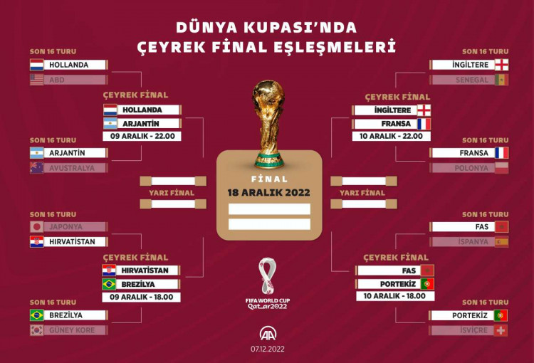 Günün diğer çeyrek final randevusunda ise Hollanda ile Arjantin, saat 22.00'de 88 bin kişilik Lusail Stadı'nda tur mücadelesi verecek.