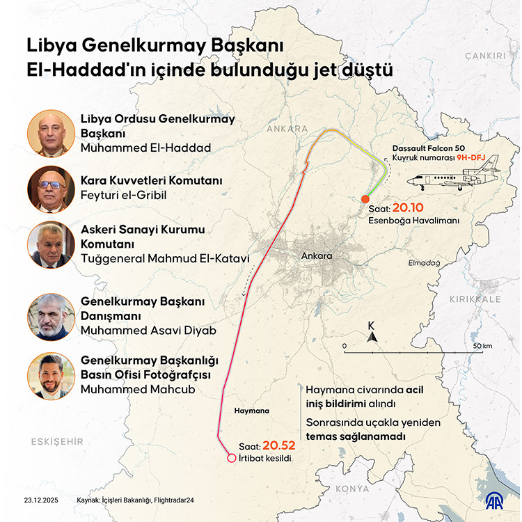 T.C. İçişleri Bakanlığı'ndan yapılan açıklamaya göre;, Ankara Esenboğa Havalimanı'ndan Tripoli'ye gitmek üzere havalanan, içerisinde Libya Genelkurmay Başkanı Orgeneral Muhammed Ali Ahmed Al-Haddad'ın da bulunduğu iş jetiyle irtibat Haymana yakınlarında kesildi.