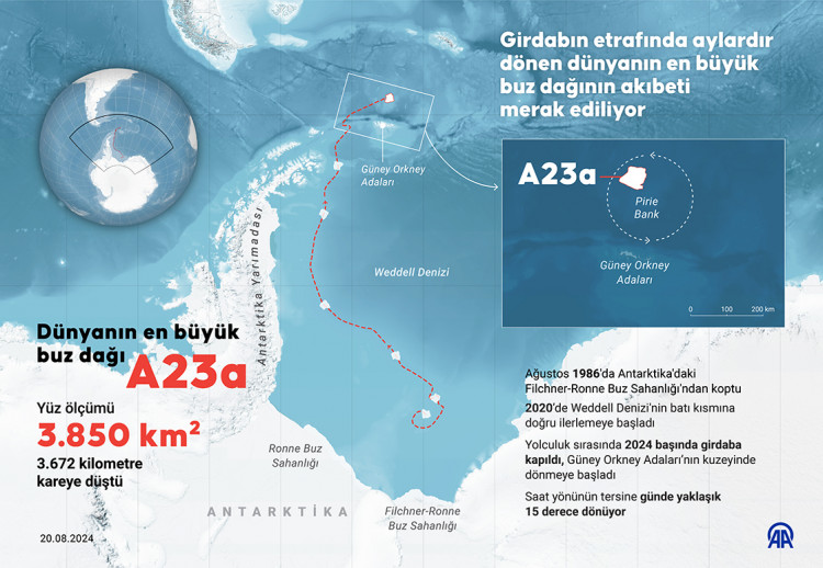 Dünyanın en büyük buz dağı olarak bilinen A23a, Ağustos 1986'da Antarktika'daki Filchner-Ronne Buz Sahanlığı'ndan koptu. Bu kopuşun ardından yaklaşık 34 yıl boyunca sabit kalan buz dağı 2020 yılında okyanus akıntılarıyla birlikte harekete geçerek Weddell Denizi'nin batı kısmına doğru ilerlemeye başladı. Ancak yolculuk sırasında bir girdaba kapılan buz dağı, bu yılın başından bu yana girdabın etrafında dönüyor. Bazı uzmanlar bu durumun, buz dağının sıcak sulara doğru gidişini engelleyeceğini ve erimesini yavaşlatacağını düşünürken bazıları da dönme hareketinin erimeyi hızlandıracağını ifade ediyor.
