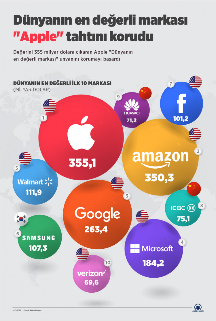 AA muhabirinin, araştırma verilerinden yaptığı derlemeye göre, değerini geçen yıla göre yüzde 35 artırarak 355 milyar dolara çıkaran Apple "Dünyanın en değerli markası" unvanını korumayı başardı. Apple, 2021 araştırmasında da 263,4 milyar dolarla ilk sırada yer almıştı.