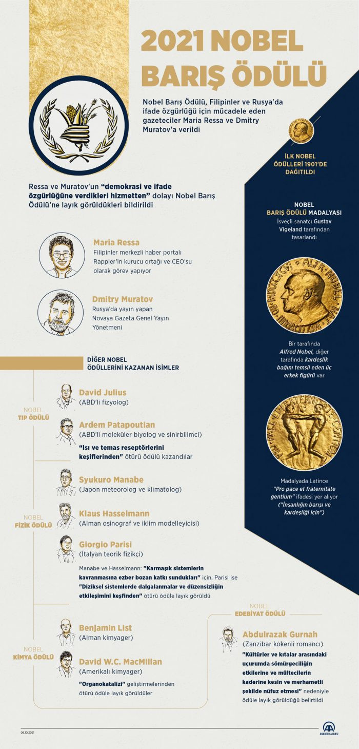 Norveç Nobel Komitesi Başkanı Berit Reiss-Andersen, yaptığı açıklamada, Rusya’da yayın yapan Novaya Gazeta Genel Yayın Yönetmeni Dmitry Muratov ile Filipinli Maria Ressa’yı, demokrasi ve ifade özgürlüğüne verdikleri hizmetten dolayı Nobel Barış Ödülü’ne layık görüldüklerini bildirdi.
