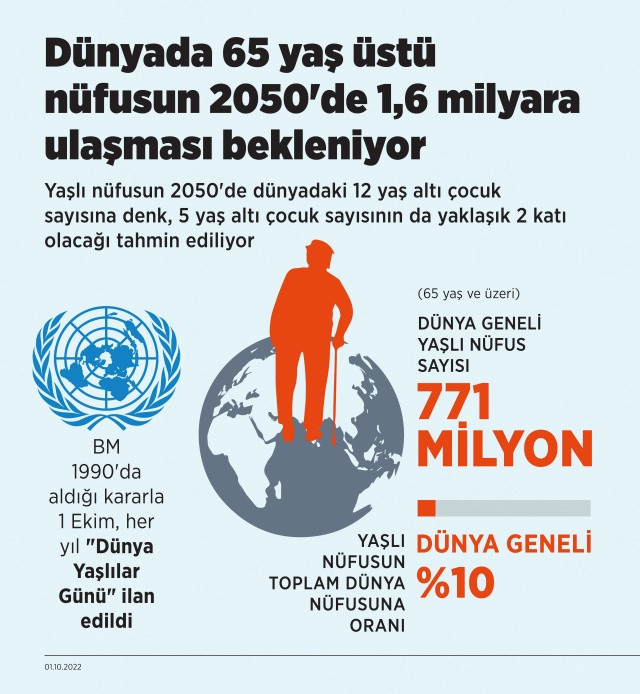Yaşlı nüfusun, dünya genelindeki nüfusa oranı 2022 itibarıyla yüzde 10 civarı olurken, bu oranın 2030’da yüzde 12’ye, 2050’de yüzde 16’ya çıkması öngörülüyor.
