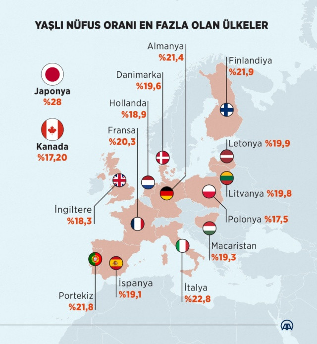 Japonya'da 65 yaş üstü vatandaşların sayısı nüfusun yüzde 28’ini oluşturuyor. Bu ülkeyi yüzde 22, 8 ile İtalya, yüzde 21,9 ile Finlandiya, yüzde 21,8 ile Portekiz, yüzde 21,4 ile Almanya, yüzde 20,3 ile Fransa, yüzde 19,9 ile Letonya, yüzde 19,8 ile Litvanya, yüzde 19,6 ile Danimarka, yüzde 19,3 ile Macaristan, yüzde 19,1 ile İspanya, yüzde 18,9 ile Hollanda, yüzde 18,3 ile İngiltere, yüzde 17,5 ile Polonya, yüzde 17,2 ile Kanada izliyor.