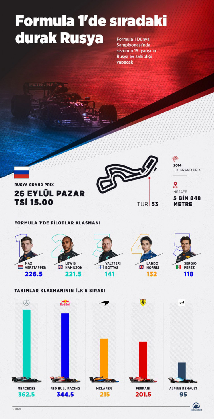 Formula 1 Dünya Şampiyonası'nın 15. ayağı, Rusya'nın Krasnodar bölgesindeki 5,8 kilometrelik Soçi Pisti'nde 53 tur üzerinden düzenlenecek.