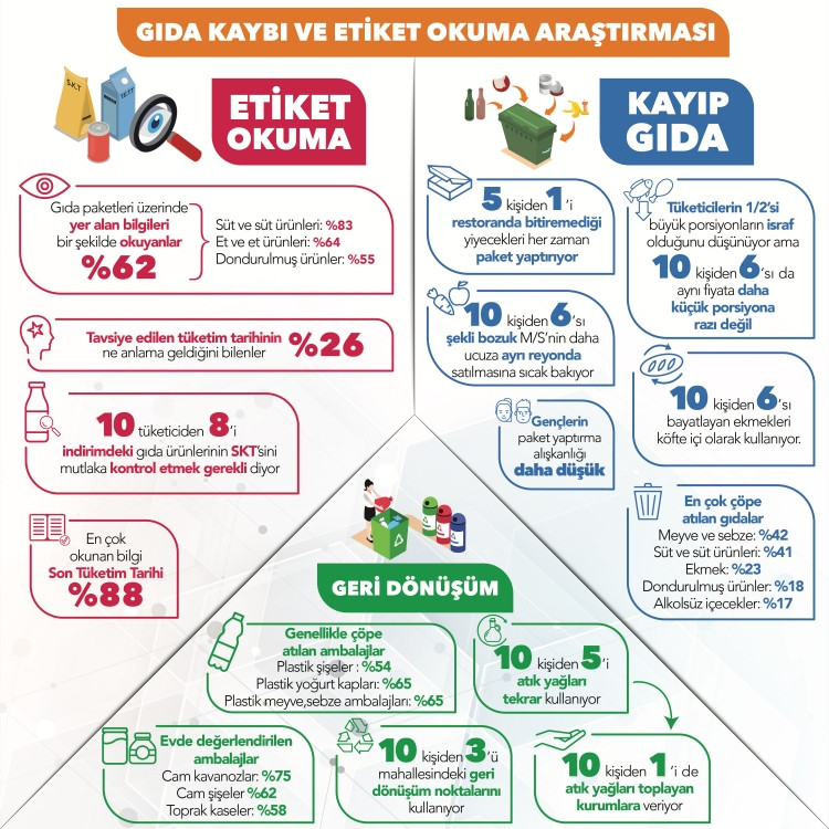 Türkiye’deki müşterilerin gıda kaybına yol açan algı ve davranışlarını belirlemek amacıyla Gıda Güvenliği Derneği tarafından Nielsen Araştırma Şirketi’ne yaptırılan ve Türkiye kent nüfusunu temsil eden 26 şehirde 18-65 yaş arası 1.545 kişi ile görüşerek gerçekleştirilen “Gıda Kaybı ve Etiket Okuma Araştırması” çarpıcı sonuçlar ortaya çıkardı.