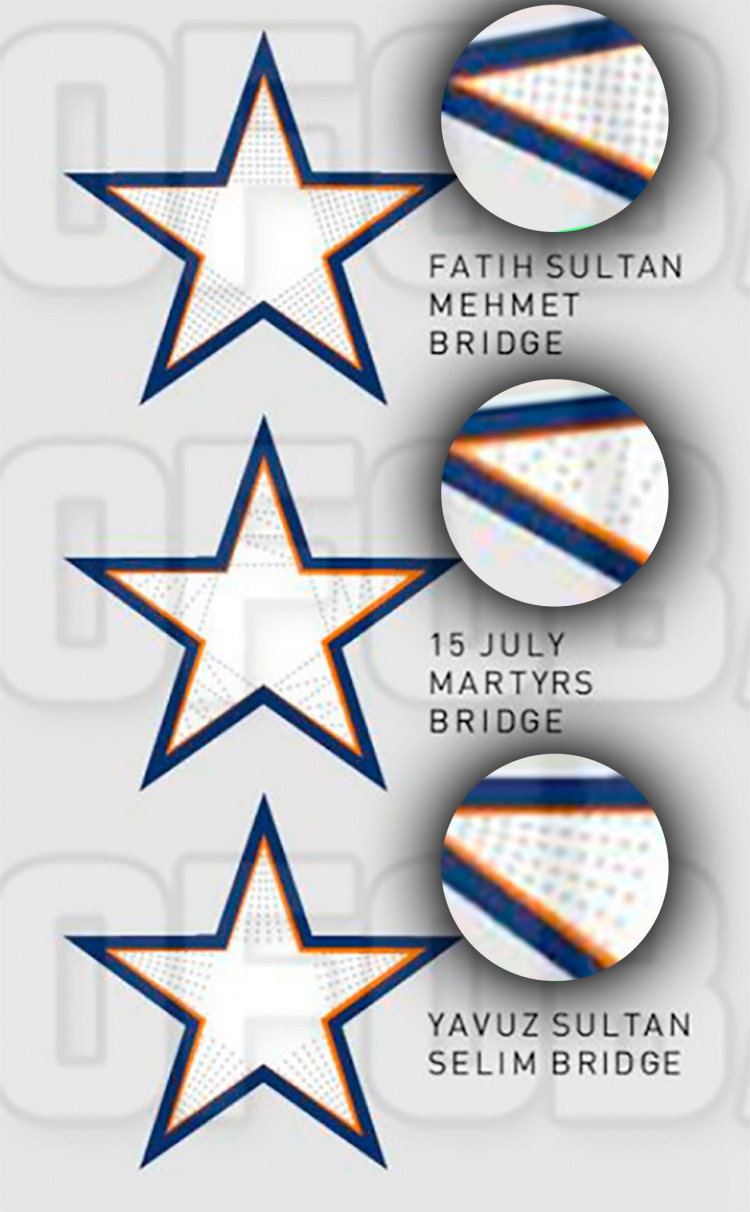 Top üzerinde bulunan yıldızlar ise içinde üç farklı desene ev sahipliği yapacak. Bu desenlerden biri Fatih Sultan Mehmet Köprüsü’nü, biri 15 Temmuz Şehitler Köprüsü’nü ve diğeri de Yavuz Sultan Selim Köprüsü’nü temsil edecek.