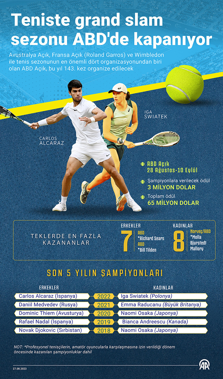 Geçen yıl tek erkeklerde Carlos Alcaraz, tek kadınlarda ise Iga Swiatek'in şampiyon olduğu ABD Açık Tenis Turnuvası'na ait öne çıkan istatistikler şöyle:
