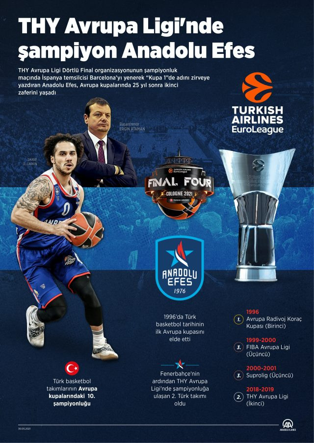 THY Avrupa Ligi Dörtlü Final organizasyonunun şampiyonluk maçında İspanya temsilcisi Barcelona’yı yenerek “Kupa 1”de adını zirveye yazdıran Anadolu Efes, Avrupa kupalarında 25 yıl sonra ikinci zaferini yaşadı.