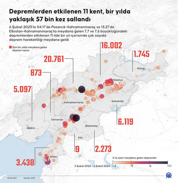 Kahramanmaraş'ın yanı sıra Hatay, Osmaniye, Adıyaman, Diyarbakır, Şanlıurfa, Gaziantep, Kilis, Adana, Malatya ve Elazığ'ı vuran asrın felaketinde 53 bin 537 kişi hayatını kaybetti, 107 bin 213 kişi yaralandı.