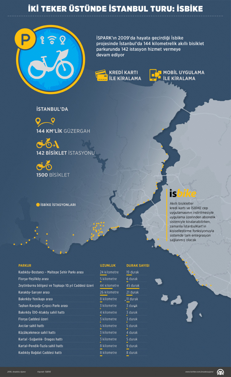 Kişi başına düşen araç sayısının her geçen gün artış gösterdiği Zeytinburnu’nda, artan trafik sorununa çözüm getirmek amacıyla faaliyete geçen İSBİKE (Akıllı Bisiklet Kiralama Sistemi) Zeytinburnu’nda resmen hizmete başladı. Bisikletle yaşamaya çok daha önceden başlamış Hollanda ve Fransa gibi Avrupa ülkelerinden örnek alınarak oluşturulan Bisiklet Kiralama Sistemi’nde yolcular, ilk yarım saat bisikleti ücretsiz kullanacak. Trafik akış hızı 30 kilometreye kadar düşen Zeytinburnu’nda, yaklaşık bir senedir Akıllı Bisiklet Sistemi’nin alt yapısını oluşturan İBB, İSPARK ve Zeytinburnu Belediyesi, İSBİKE ile ilçedeki trafik sorununu yüzde 40 oranında düşürmeyi hedefliyor.