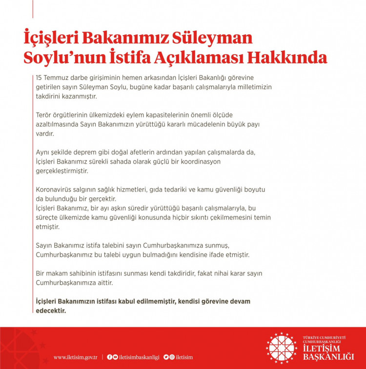 İçişleri Bakanı Süleyman Soylu'nun istifa açıklaması hakkında, İletişim Başkanlığı açıklama yaptı. Açıklamada, 15 Temmuz darbe girişiminin hemen arkasından İçişleri Bakanlığı görevine getirilen Süleyman Soylu'nun, bugüne kadar başarılı çalışmalarıyla milletin takdirini kazandığı belirtildi.