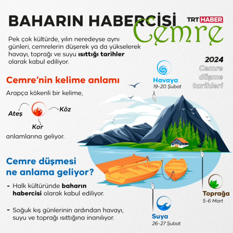 19-20 Şubat’ta havaya düşen cemrenin ikincisi suya düşerken, bu tarihten itibaren suyun ısınması bekleniyor. Üçüncü ve son cemre 5-6 Mart tarihlerinde de toprağa düşecek ve bu tarihten sonra hava sıcaklığında artış devam edecek.