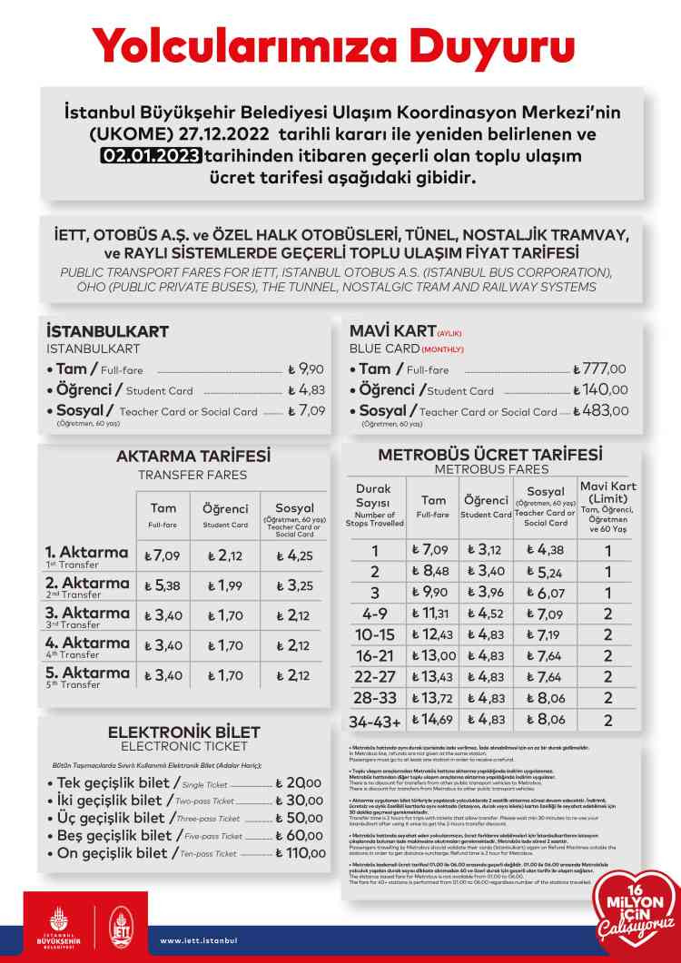 Toplu ulaşım ücretleri zamla birlikte tam bilet 9,90'dan 15 TL'ye, öğrenci 4,83'ten 7,32 TL'ye çıktı. Metrobüs tam bilet ücreti 22,25 TL'ye, taksi açılış ücreti 19,17 TL'ye indi-bindi ücreti 70 TL'ye yükseldi.