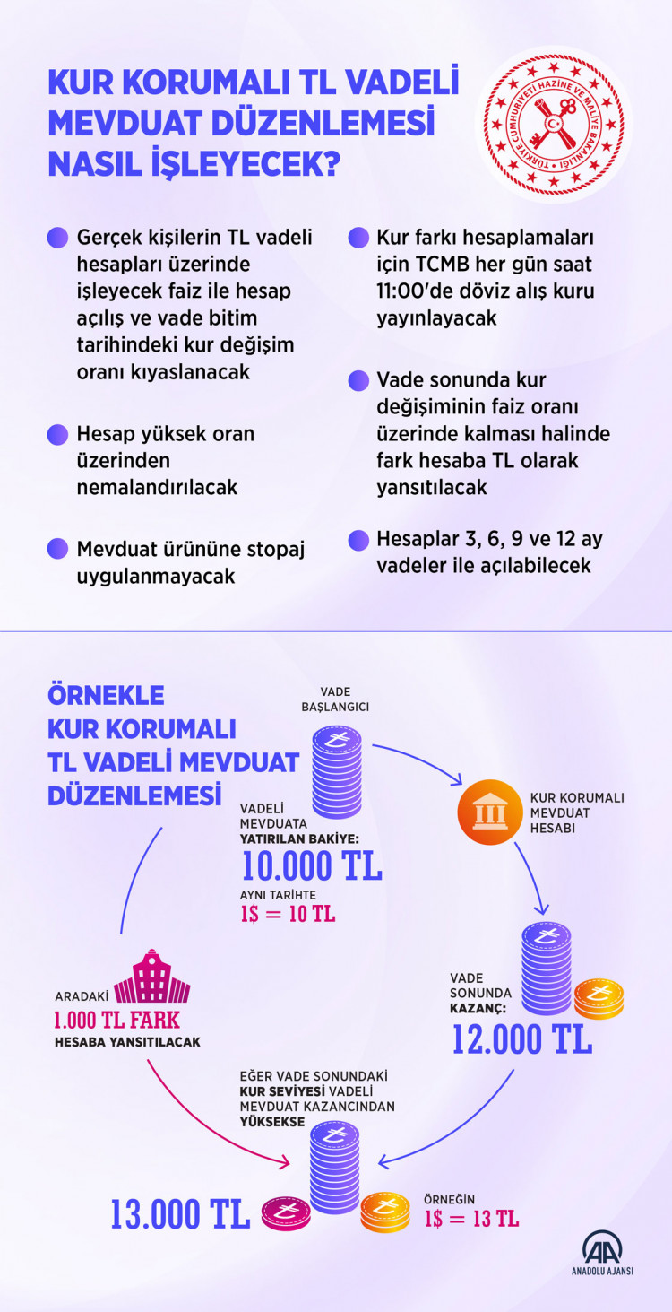 "Kur Korumalı TL Vadeli Mevduat"ta gerçek kişilerin Türk lirası vadeli hesapları üzerinde işleyecek faiz ile hesap açılış ve vade tarihlerindeki kur değişim oranının kıyaslanacak, yüksek oran üzerinden hesap nemalandırılacak.