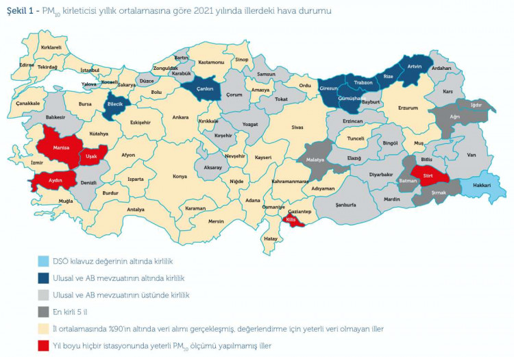 Havayı kirleten en önemli maddelerden partikül madde PM10 değerlerine bakıldığında, 2021’de en kirli havayı soluyan ilk beş il sırasıyla, Batman, Iğdır, Ağrı, Şırnak ve Malatya oldu. Bu illerde yıllık ortalamalar, Dünya Sağlık Örgütü’nün (DSÖ) partikül madde PM10 için belirlediği 15 μg/m3 olan kılavuz değerin 5-8 katıydı. 200 günden fazla günde ise PM10 için yönetmelikte belirlenen 40 μg/m3 ulusal limit değerinin üstünde hava kirliliği ölçüldü.