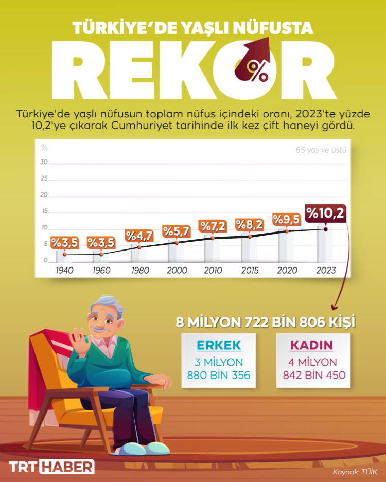 Türkiye İstatistik Kurumu (TÜİK) verilerine göre, Türkiye'de yaşlı nüfusun toplam nüfus içindeki oranı 2023'te yüzde 10,2'ye çıktı. Bu oran, Cumhuriyet tarihinde ilk kez çift haneyi gördü.
