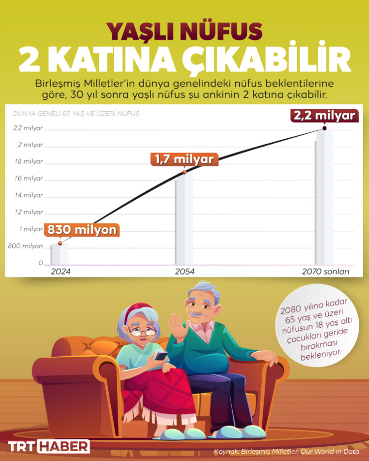 2070’lerin sonunda yaşlı nüfusun 2,2 milyara ulaşması bekleniyor. 2080 yılına kadar ise 18 yaş altı çocukları geride bırakacağı öngörülüyor.