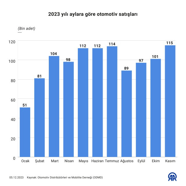 Kasım ayı özelinde bakıldığında ise otomobil ve hafif ticari araç satışları geçen yılın aynı dönemine göre yüzde 39,8 artarak 115 bin 40'a yükseldi. Geçen ay otomobil satışları yüzde 54,4 artışla 91 bin 424, hafif ticari araç satışları da yüzde 2,3 yükselerek 23 bin 616 olarak kayıtlara geçti.