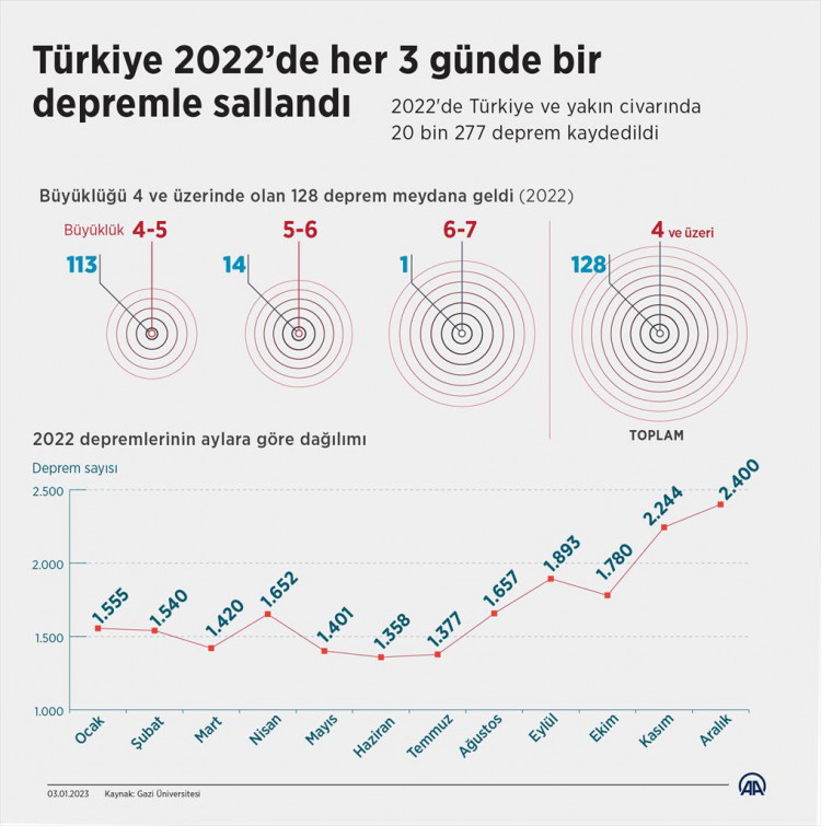 Gazi Üniversitesi Mühendislik Fakültesi İnşaat Mühendisliği Bölümü Öğretim Üyesi ve Afet Yönetimi Uzmanı Doç. Dr. Bülent Özmen, geçen yıl dünyada ve Türkiye'de yaşanan deprem hareketliliğine ilişkin bilgi verdi.