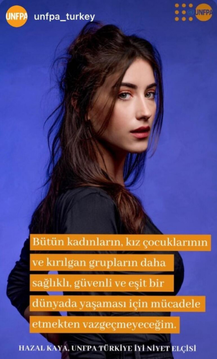 Oyuncu Hazal Kaya, Birleşmiş Milletler Nüfus Fonu (UNFPA) Türkiye’nin iyi niyet elçisi seçildi.