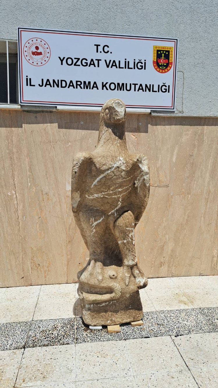Yozgat'ta düzenlenen operasyonda tarihi eser niteliği taşıdığı değerlendirilen 150 santimetre yüksekliğinde mermer kartal heykeli ele geçirildi, bir şüpheli yakalandı.