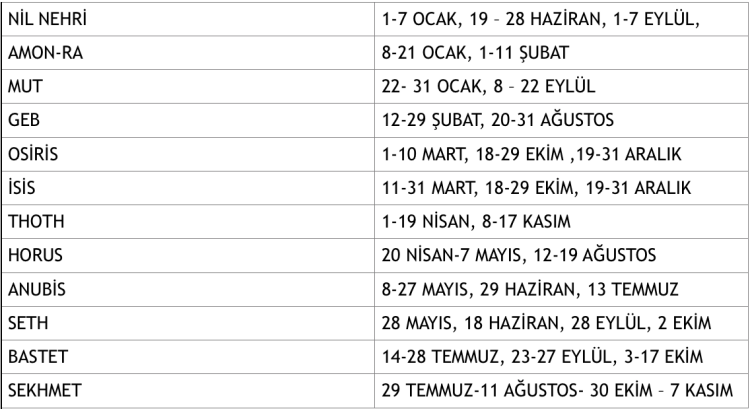 Eski Mısırlılar, ibadet ettikleri Tanrıların insanları günlük yaşamlarının her alanında etkilediğini düşünüyordu. Bu nedenle, bir kişinin karakterinin, yaşamının ve başarısının, doğdukları yıldız tarafından yönetildiğine inanıyorlardı. Klasik Mısır takviminde, Aylar ‘on yıl’ adı verilen ve her biri on farklı gün olmak üzere üç alt bölümü ayrılmıştır. Eski Mısırlılar, aslında Sİrius ve Orion gibi ünlü yıldızlar olan bir dekans sistemi kurdular. Bir çocuk doğduğunda, rahipler bazen ebeveynler için bir yıldız haritası çizerdi.