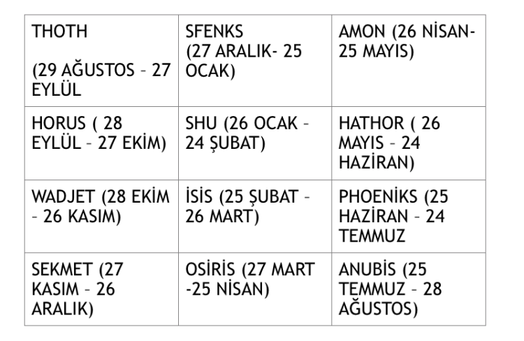 Eski Mısırlıların Eski Yunanlardan Babil astrolojisi hakkında öğrendiklerinin etkilerine dayanarak bir tarih verir. Batı Astrolojisine çok benzer. Batı Astrolojisi gibi 12 burçtan oluşur. Her bir burç, Koç, Boğa, Aslan vb. gibi üzerindeki işaretleri temel almasına benzer şekilde Tanrı ve Tanrıçalara dayandırmaktadır. İşaretinizin Tanrı veya Tanrıçası karakterinizi, davranışınızı ve becerileriniz temsil eder.