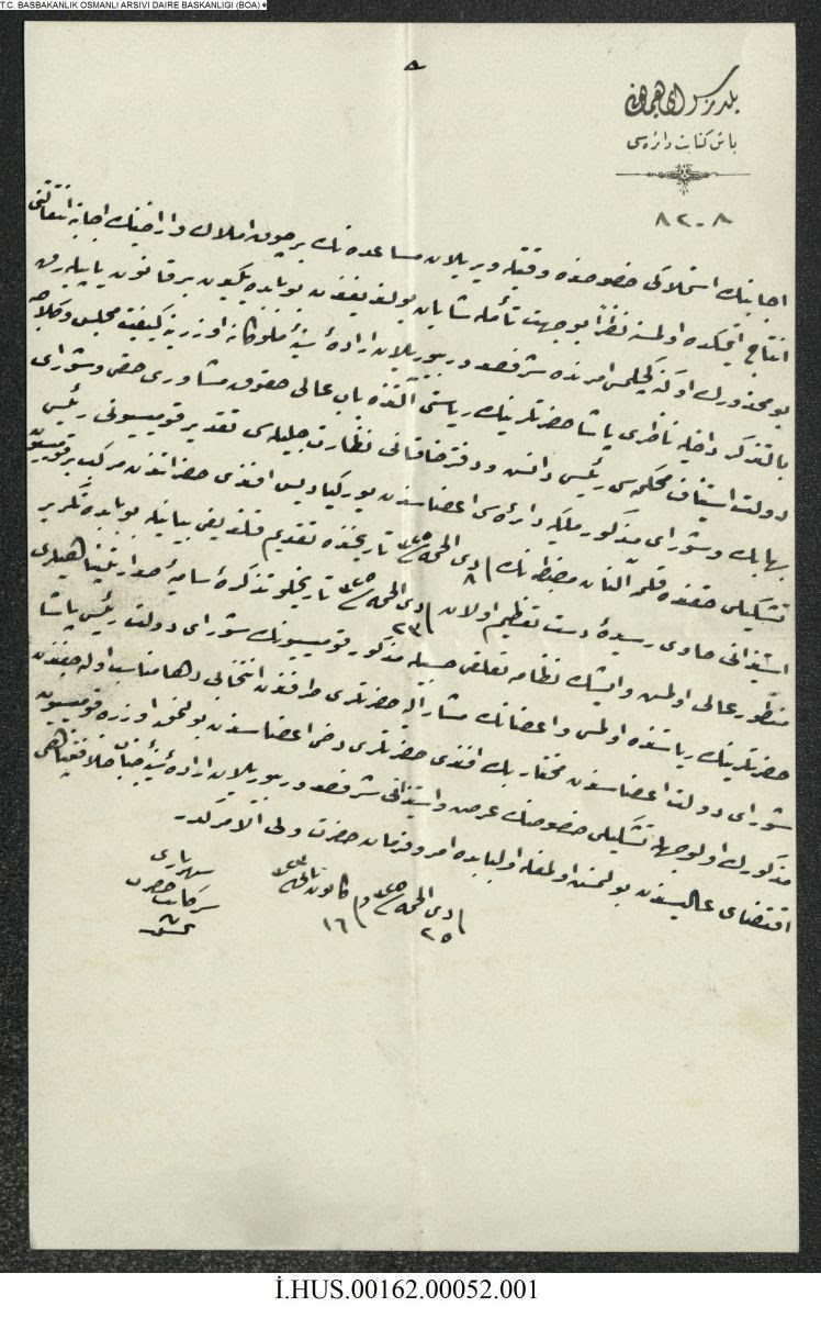 Yabancıların emlâk satın almaları için vaktiyle verilmiş olan izin, birçok emlâk ve arazinin ecnebilerin eline geçmesine sebep olmaktadır. Bu bakımdan meselenin etraflıca düşünülmesi gerekli olup yeniden bir kanun yapılarak bu mahzurun önüne geçilmesi yönündeki zat-ı şahanelerinin iradesi üzerine keyfiyet hükümetçe görüşülmüştür. Dâhiliye Nazırı Paşa’nın başkanlığında Bâbıâlî Hukuk Müşaviri Hakkı, Şûra-yı Devlet İstinaf Mahkemesi reisi Daniş, Defter-i Hakanî Takdir Komisyonu reisi Baha Bey ve Şûrâ-yı Devlet Mülkiye Dairesi azasından Yorgiyadis efendilerden oluşan bir komisyon teşkiline dair kaleme alınan mazbata 12 Ocak 1908 tarihinde takdim edilmiş ve konu hakkında tekrar izin talep eden 27 Ocak 1908 tarihli sadaret tezkeresi zat-ı şahaneleri tarafından görülmüştür. Bu mesele bir nizam gerektirdiğinden söz konusu komisyonun Şûrâ-yı Devlet reisinin başkanlığında kurulması, üyelerinin de onun tarafından seçilmesi münasip olacağı gibi Şûrâ-yı Devlet azasından Muhtar Beyefendi’nin dahi komisyonda yer almasının uygun olacağı padişahımızın emir ve iradeleri gereğindendir.