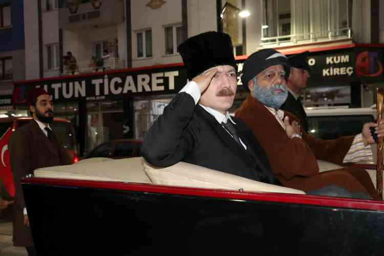 Atatürk'ü canlandıran Devlet Tiyatrosu oyuncusu Abdülsamet Sünbül, üstü açık arabayla güzergah boyunca halkı selamladı.