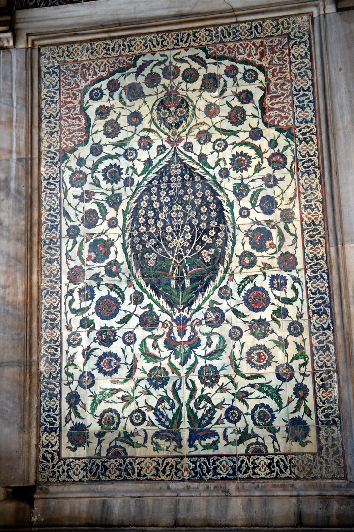 Türbenin sağında bulunan 60 adet çini hakkında değerlendirmede bulunan Cengiz, "Bu çiniler 1890'lı yıllarda, Osmanlı devletine dişçi olarak gelen, Fransa uyruklu Albert Dorigny tarafından restorasyonu yapılmak üzere Fransa'ya götürülüp taklidi yapılarak daha sonra buraya monte edilen çinilerdir. Hemen sol tarafından ise bunun kardeş çinileri var ve baktığınızda iki çini pano arasındaki farklı görürsünüz. Bu çiniler aslında 16. yüzyıl İznik çinilerinin en mükemmel örneklerindendir." diye konuştu.