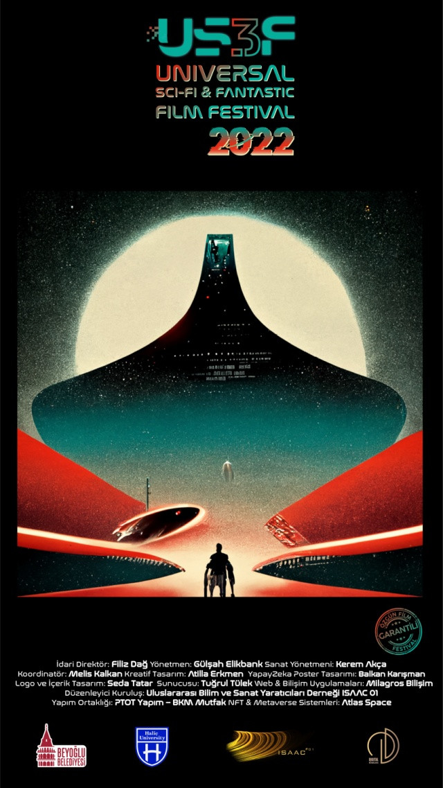 “Evrensel Bilim Kurgu ve Fantastik Film Festivali”nin kadrosu sinema, reklam, etkinlik ve oyun gibi sektörlere içerik üretmiş, alanında uzman isimlerden oluşurken; yaratıcı kadro ise kamusal alanda eserleri sergilenmiş dijital sanatçılardan meydana geliyor. Ürettiği NFT eserlerle hem yurt içi hem de yurt dışında pek çok sergiye imza atan dijital sanatçı Balkan Karışman da festivalin temasına uygun şekilde yapay zekâya alternatif afiş görselleri tasarlatan isim olarak bu yaratıcı kadroda yer alıyor. Balkan’ın yapay zekâya tanımlayarak, festival verileri üzerinden elde ettiği afiş serisi, aynı zamanda günümüzün bu alandaki teknolojilerinin nasıl ve nerelerde kullanılabileceği ile ilgili örnek teşkil ediyor.