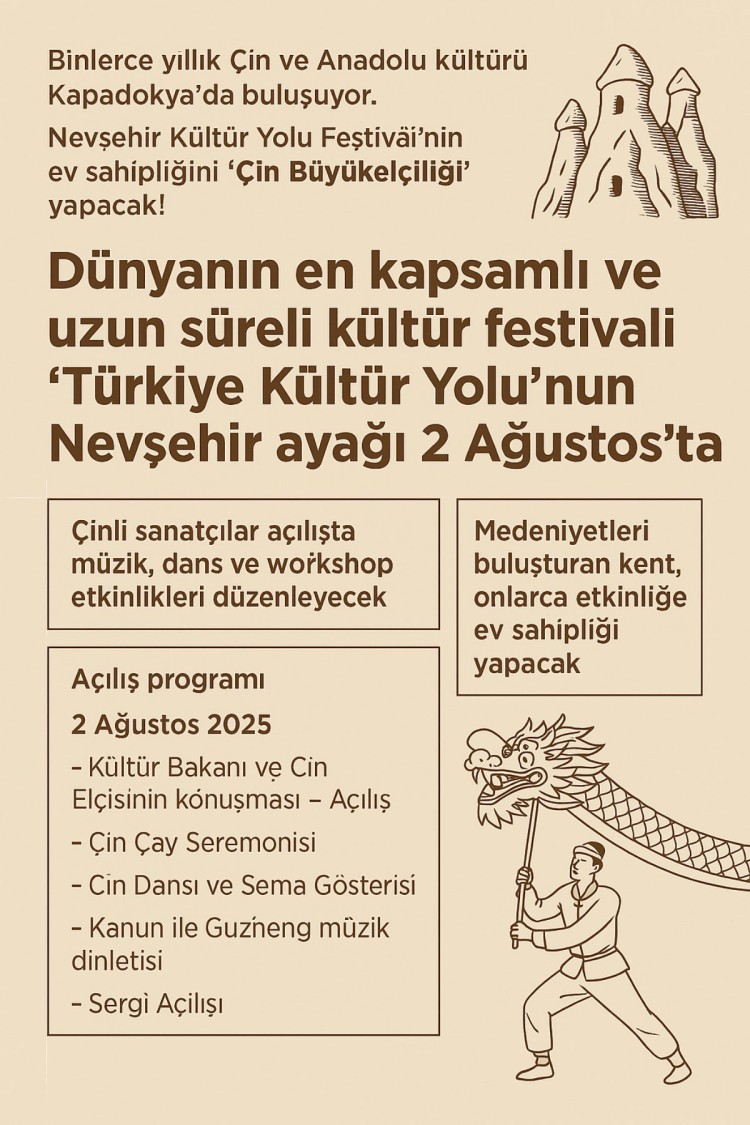 Türkiye'nin kültürel çeşitliliğini uluslararası sahneye taşıyan ve şehirleri sanatsal cazibe merkezlerine dönüştürme hedefiyle yola çıkan Türkiye Kültür Yolu Festivali, bu yıl 8'inci durağında Nevşehir’e konuk oluyor. UNESCO Dünya Mirası Listesi’nde yer alan Kapadokya bölgesinde gerçekleştirilecek olan etkinlikler, Çin Büyükelçiliği’nin ev sahipliğinde, Çin ve Anadolu kültürlerinin binlerce yıllık mirasını buluşturacak. 2-10 Ağustos tarihleri arasında yapılacak festival, farklı disiplinlerden sanat etkinlikleriyle Kapadokya’nın tarihî atmosferini bir sanat sahnesine dönüştürecek.