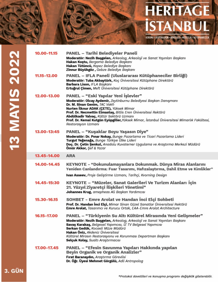 Heritage İstanbul'un halen eektörün tek organizasyonu olduğuna dikkat çeken Akan: "Fuarımız yeni alanlar ve birliktelikler yaratarak ülke ekonomisine olumlu sinyallerin artmasını sağlayacak adımları atmaya, ülkemizin müzecilik, arkeoloji restorasyon ve kütüphanecilik sektörlerini biraya getiren bu kapsamlı etkinlikte uluslararası aktörleri yurdumuza getirmeye devam ediyor. Uluslararası 33, ulusal 100’ün üzerinde katılımcı firmaya ilave olarak tüm sektörel Sivil Toplum Kuruluşlarını bir çatıda toplayan ve tabi ki ülkemizin kültür mirası alanındaki başat kamu kurumlarının desteği ile 7000’i aşkın ziyaretçisiyle büyüyen bir aileyiz. 11-13 Mayıs tarihleri arasında Lütfi Kırdar Kongre ve Sergi Sarayı’nda TG Expo tarafından gerçekleştirilecek T.C. Kültür ve Turizm Bakanlığı, T.C. Kültür ve Turizm Bakanlığı Vakıflar Genel Müdürlüğü ile İstanbul Büyükşehir Belediyesi’nin büyük destekleri ile organize ettiğimiz Heritage İstanbul 2022’de, fuara eş zamanlı olarak düzenlenen konferanslar, seminer ve diğer yan etkinliklerde dünyaca ünlü iki yüze yakın arkeolog, restoratör, konservatör, mimar ve müzeci bilgi ve birikimini dinleyicilerle paylaşacak. Fuar ile eş zamanlı düzenlenecek konferans, miras sohbetleri ve atölye çalışmalarında; üç gün boyunca 8’i keynote olmak üzere 100’ü aşkın konuşmacının yer aldığı 48 oturum gerçekleşecektir. Bu vesileyle tüm paydaşlarımıza bir kez daha teşekkürlerimizi sunarken, Heritage İstanbul’un bir kez daha tüm kültür camiasına hayırlı olması en büyük temennimiz.” şeklinde konuştu.