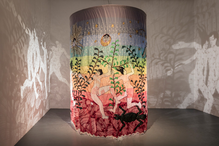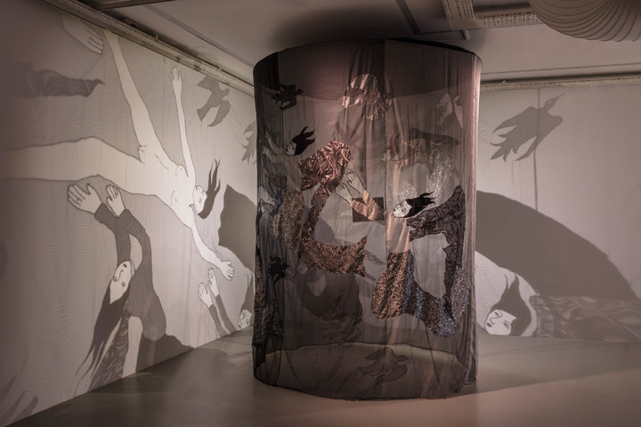 Tülden bir silindir şeklinde tavandan yere doğru uzanan ve kendi ekseni etrafında yavaşça dönen “Cennet” (2017) adlı başka bir yeni iş, ışık-gölge oyunu aracılığıyla görünen ve görünmeyenler, gerçek ve kurgusal dünyalar arasında bağlar kuruyor. Yerleştirmede kadın, erkek ve çift cinsiyetli figürler, gökkuşağının yedi rengi ve masalsı yaratıklar eşliğinde dönerlerken, çıplak bedenlerinin gölgeleri de duvarlarda geziniyor. Duvardaki gölgeler, eril ve dişil özellikleriyle birbirlerine karışırken, onlara yaklaştıkça bizim gölgelerimizle de karışmaya başlıyorlar. “Araf” (2017) ise alt kattaki kurgunun aynısını bu kez Araf teması üzerinden yorumluyor. Gri tonlarının hâkim olduğu tül yerleştirmede, melekler ve kuşlar eşliğinde karanlıklardan dışarı doğru süzülen bir karakterin hikâyesiyle karşılaşıyoruz. Sergi, ikinci katın tamamına yayılan “Garâib’ül-mevcûdât” (2017) yerleştirmesiyle son buluyor. Bu katta, insan figürleri tamamen kayboluyor ve sahneyi cinler kaplıyor. Tüller üzerine floresan boyalarla çizilmiş cinlerin tamamının karartılmış olan mekâna yayıldığı bu cehennem bizi korkularımızla yüzleşmeye, cin dediklerimizle bir arada olmaya davet ediyor.