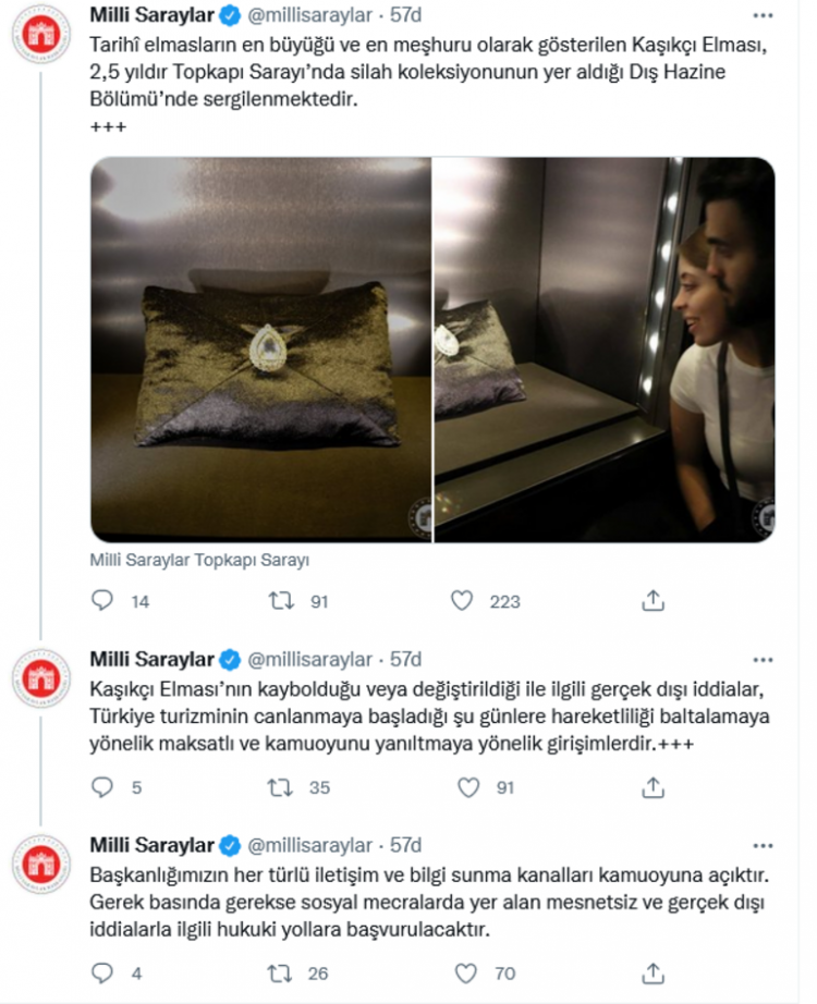 Milli Saraylar, Kaşıkçı Elması'nın Topkapı Sarayı'ndan çalındığı iddialarını sosyal medya hesabından yaptığı fotoğraflı açıklamayla yalanladı. Açıklamada "Gerek basında gerekse sosyal mecralarda yer alan mesnetsiz ve gerçek dışı iddialarla ilgili hukuki yollara başvurulacaktır" ifadelerine yer verildi.