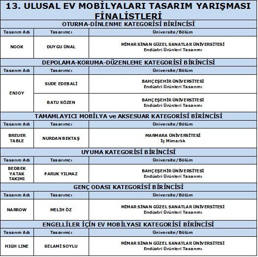 Oturma ve dinlenme kategorisinde birinciliği Duygu Ünal, nook adlı tasarımı ile, depolomala, koruma, düzenleme kategorisinde birinciliği Sude Edebali ve Batu Sözen, Enjoy adlı tasarımları ile, Tamamlayıcı mobilya ve aksesuar kategorsinde birinciliği Nurdan Bektaş, Breuer Table adlı tasarımı ile, Uyuma kategorisinde birinciliği Faruk Yılmaz, bebek yatak takımı adlı tasarımı ile Genç Odası kategorisinde birinciliği Melih Öz, narrow adlı tasarımı ile ve Engelliler için ev mobilyası kategorisinde birinciliği Selami Soydan, High Line adlı tasarımı ile kazandı.