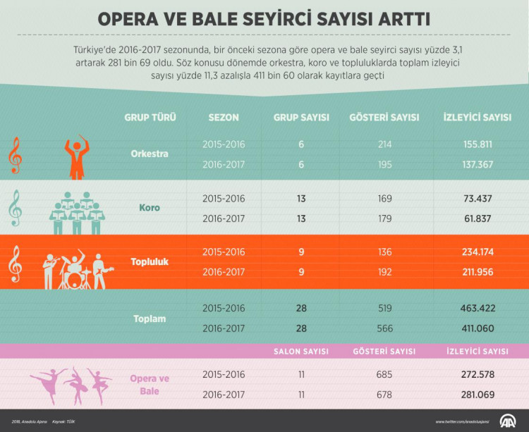 Türkiye'de 2016-2017 sezonunda, bir önceki sezona göre opera ve bale seyirci sayısı yüzde 3,1 artarak 281 bin 69 oldu. Söz konusu dönemde orkestra, koro ve topluluklarda toplam izleyici sayısı yüzde 11,3 azalışla 411 bin 60 olarak kayıtlara geçti.