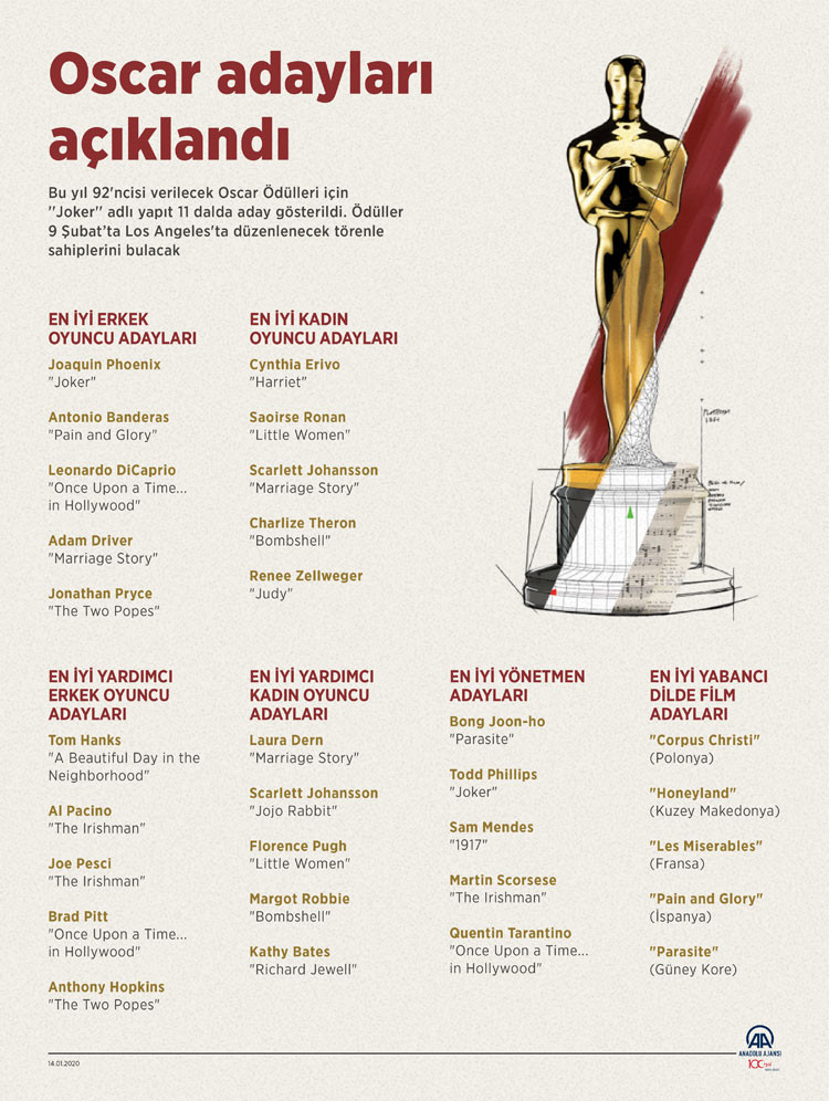 Bu yıl 92'ncisi verilecek Oscar Ödülleri için ''Joker'' adlı yapıt 11 dalda aday gösterildi.