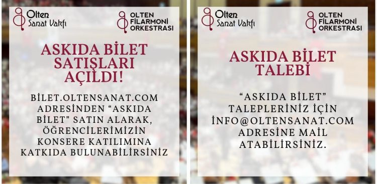 Olten Filarmoni Orkestrası'nın askıda bilet taleplerine destek olmak isteyenler, [email protected] veya bilet.oltensanat.com adreslerinden bilet satın alarak, öğrencilerin konserlere katılmasına katkı sağlayabiliyor. Olten Filarmoni Orkestrası askıda bilet uygulaması sayesinde gençlere ve öğrencilere sanatı ulaşılabilir kılmayı hedefliyor.