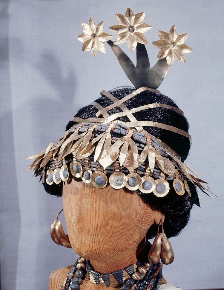 Sümer Kraliçesi Puabi, tonozlu bir taş mezar odasına gömüldü, vücudu ayrıntılı bir altın başlık, boncuklu bir üst ve altın ve değerli taşlardan yapılmış bir kemer ile süslendi. Penn Müzesi‘nin izni ile Foto 251051