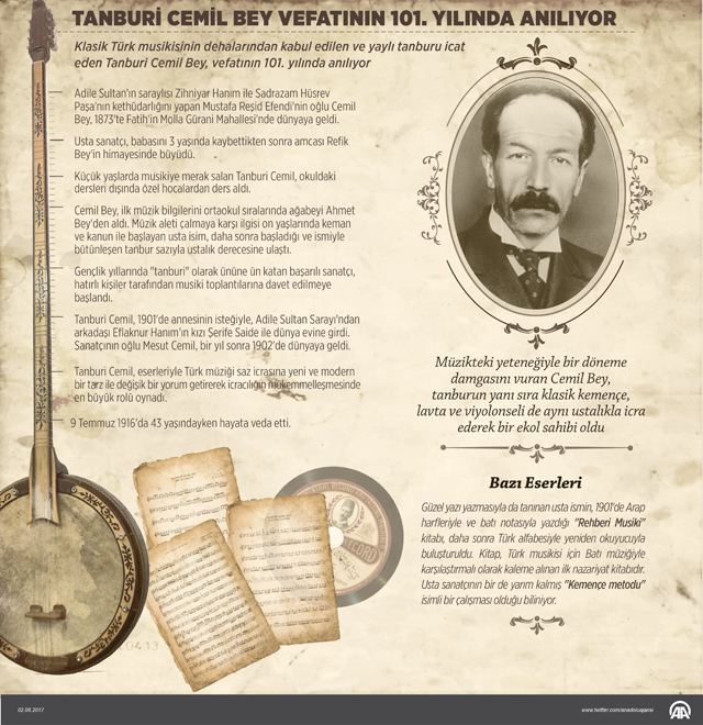 Tanburi Cemil Bey'in hayatına ilişkin bilgiler, oğlu Mesud Cemil'in "Tanburi Cemil'in Hayatı" kitabı, yazar Lütfiye Aydın'ın "Dehanın Sesi" isimli kitabıyla günümüze kadar ulaştı.