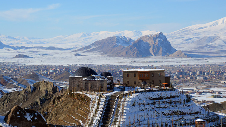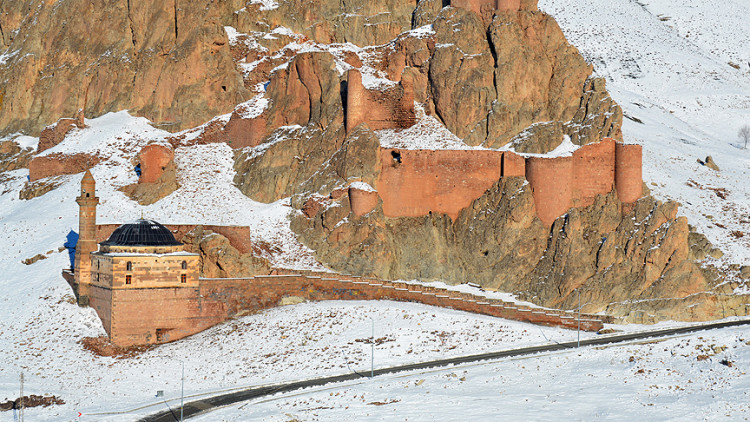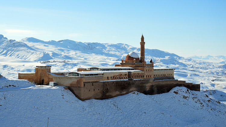 Kentte yılbaşından itibaren aralıklarla etkisini gösteren kar yağışı nedeniyle, Doğu Anadolu Bölgesi'nin görkemli tarihi yapıları arasında yer alan ve Osmanlı mimarisinin en seçkin örneklerinden olan İshak Paşa Sarayı ve çevresi de karla kaplandı.
