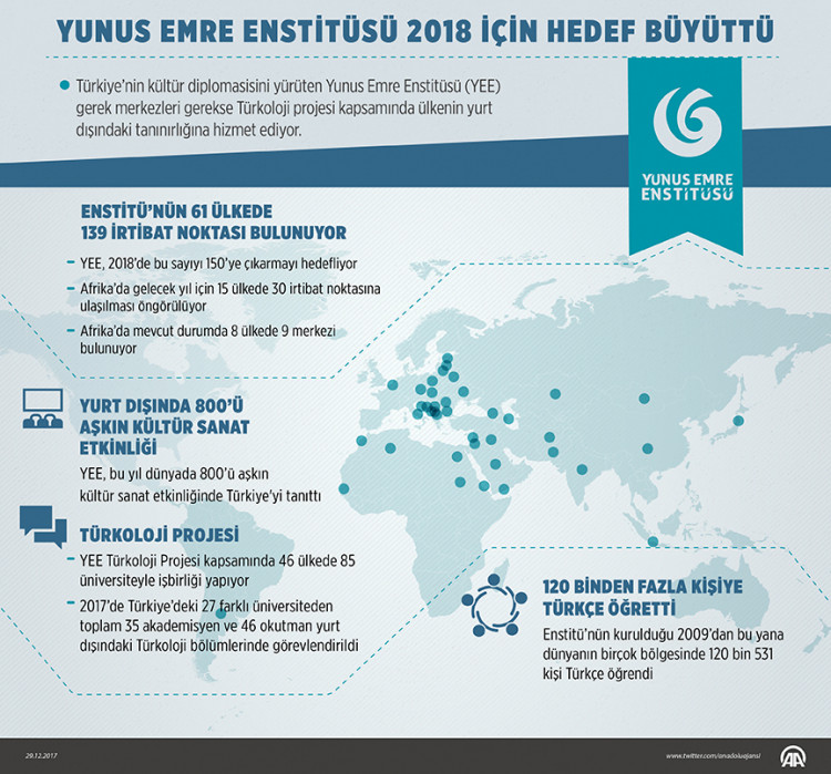Türkiye’nin kültür diplomasisini yürüten Yunus Emre Enstitüsü (YEE), 2018'de yurt dışındaki irtibat noktasını ve dünyanın farklı ülkelerinde Türkiye'yi tanıtmak için düzenlediği kültür sanat etkinliklerini artırmayı amaçlıyor.